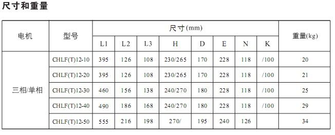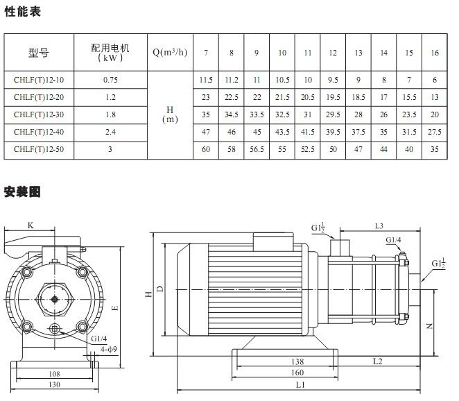 產品介紹 CHLF(T)12-10臥式節段式多級離心泵非自吸離心泵是渤泉泵業制造有限公司制造的主導產品,配加長軸電機采用了免修機械密封,緊湊式結構使泵尺寸很小,軸向入口和徑向出口。輕型段式多級離心泵的過流部件均采用不銹鋼材料(304或316)制成,輕型不銹鋼多級離心泵具有低噪音,耐輕腐蝕,外形美觀、體積小、重量輕、使用壽命長等特點,不同材質的硬質合金密封,保證了不同介質輸送均無泄漏;噪音低:兩個低噪音軸承下的水泵,運轉平穩,除電機微弱聲響,基本無噪聲;故障率低:結構簡單合理,整機無故障工作時間大大提高。采用國內優秀水力模型優化設計而成,是理想的新一代高效節能輕型臥式多級離心泵。采用了免修機械密封。輕型段式多級離心泵的過流部件均采用不銹鋼材料(304或316)制成,具有低噪音,耐輕腐蝕,外形美觀、體積小、重量輕、使用壽命長等特點。 二、應用范圍: CHLF(T)12-10臥式節段式多級離心泵主要用于家庭型中央空調循環及工業上液體的傳輸。如脫礦物質水、軟水、凈化系統、輕油等的循環和增壓。 1)小型中央空調循環 2)冷卻系統 3)工業清洗 4)水處理(水的凈化) 5)水產養殖 6)施肥/計量系統 7)環境應用 三、工作條件: 稀薄、干凈、不凝、不爆炸、不含固體顆粒或纖維的液體。 液體溫度: 常溫型-15℃至+70℃ 熱水型+70℃至+110℃ 最大環境溫度:+40℃ 最大運作壓力:10巴 最大進口壓力受最大運作壓力限制 介質酸堿性:PH4~9 四、輸送液體: 1、稀薄、清潔、不含固體顆粒或纖維的非易燃易爆液體。 2、泵可以輸送諸如礦泉水、軟化水、純水、清油和其它輕化工介質。 3、當輸送液體的密度或粘度大于水,如需要,必須配用大功率電機。 4、泵是否適用于某一特定液體由多種因素決定,其中最重要的是氯含量、PH值、溫度和溶濟、油的含量等。 五、曲線條件: 下述條件適用于后面所示性能曲線。 1、所有曲線都基于電機在恒速2900rpm的測量值。 2、曲線容差符合ISO9906,附錄A。 3、測試采用20℃不含空氣的水,運動粘度為1mm2/s。 4、泵的使用參照加粗曲線的性能范圍,以防流量過小產生過熱和流量過大使電機過載等。 六、電機: 輕型段式多級離心泵電機為全封閉,風冷式二極電機 防護等級:IP55 絕緣等級:F 標準電壓, 50Hz: 1×220-240V 3×220-240V 380-415V