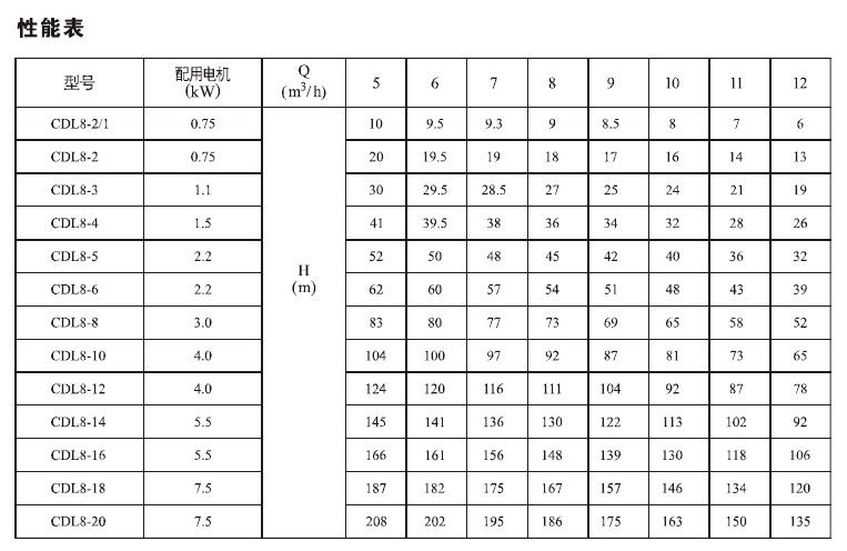 產品介紹 CDL/CDLF8-8FSWSC不銹鋼鍋爐給水增壓泵是一種多功能產品,可以輸送從自來水到工業液體的各種不同介質,適應于不同溫度、流量和壓力范圍,CDL適用于無腐蝕性液體,CDLF適用于輕度腐蝕性液體。 水:水廠過濾與輸送、水廠分區送水、主管增壓、高層建筑增壓。 工業增壓:流程水系統、清洗系統、高壓沖洗系統、消防系統。 工業液體輸送:冷卻和空調系統、鍋爐給水和冷凝系統、機床配套、酸和堿。 水處理:超濾系統、反滲透系統、蒸餾系統、分離器、游泳池。 灌溉:農田灌溉、噴灌、滴灌。 運行條件 稀薄、干凈、非易燃易爆并不含固體顆粒或纖維的液體。 液體溫度:常溫型 -15℃至+70℃ 熱水型 -15℃至+120℃ 環境溫度:最高+40℃ 海拔:最高1000m CDL/CDLF8-8FSWSC不銹鋼鍋爐給水增壓泵為安裝標準電機的非自吸式多級離心泵,電機軸通過泵頭用軸聯器直接與泵軸連接,拉桿螺栓將耐壓筒、過流部件固定在泵頭和進出水段之間,泵進出水口在泵底同一直線上;本泵可根據需要配置智能保護器,對泵干轉、缺相、過載等進行有效保護。 電機 電機為全封閉,風冷式二極標準電機。 防護等級:IP55 絕緣等級:F 標準電壓, 50Hz ![]() ![]() ![]() 因產品生產批次、型號不同,產品圖片及安裝尺寸僅供參考,詳情可聯系我們的銷售人員了解更多CDL/CDLF8-8FSWSC不銹鋼鍋爐給水增壓泵相關信息!