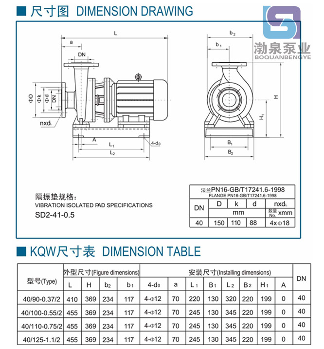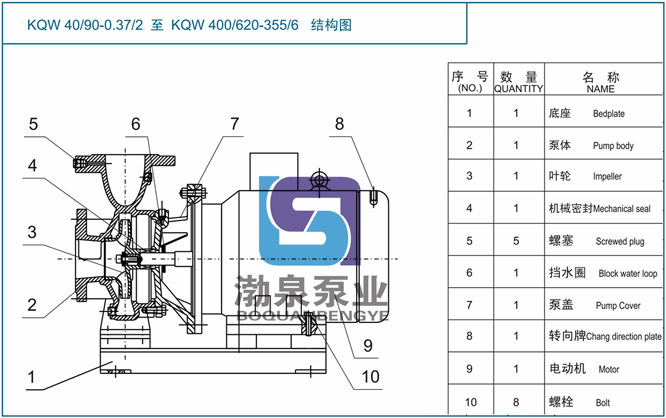 工作條件 轉(zhuǎn)速:2960r/min,980r/min或740r/min 流量范圍:1.6~3600m3/h 揚(yáng)程:≤127m 介質(zhì)溫度:-10℃~80℃、120℃ 環(huán)境溫度:最大+40℃ 最大工作壓力:1.6MPa(200及以下口徑)和1.0MPa(250及以下口徑) 汽蝕余量是實(shí)測(cè)值,實(shí)際使用時(shí)應(yīng)加0.5m的安全裕量。 可選配PN16-GB/T17241.6-1998配對(duì)法蘭。 材質(zhì) 泵殼、泵蓋、葉輪:鑄鐵 泵軸(不分段的):不銹鋼(2Cr13)或45#鍍鉻 機(jī)械密封動(dòng)、靜環(huán):石墨、硬質(zhì)合金 (KQW40/90-0.37/2~KQW500/860-560/8) 填料密封:KQW500/630-200/8~KQW500/860-560/8 結(jié)構(gòu) 結(jié)構(gòu)緊湊的臥式單級(jí)泵,是最適用于現(xiàn)代建筑物的。 泵殼 泵腳支承型式的螺旋形泵殼,采用現(xiàn)代最優(yōu)水力模型設(shè)計(jì)制造,水平吸入,上方輸出,且口徑相同。法蘭符合GB/T17241.6-1998,并帶有Rp1/4或Rp3/8測(cè)壓口。 葉輪 閉式鑄鐵葉輪,優(yōu)秀的水力模型保證泵的效率和可靠性。 機(jī)械密封 用于水溫80℃、120℃以下免保養(yǎng),并不受轉(zhuǎn)向限制。特殊波紋管設(shè)計(jì)保證了動(dòng)環(huán)的補(bǔ)償性和密封性可能。 型號(hào)說明 例如: KQW80/160-7.5/2 KQW 標(biāo)準(zhǔn)臥式單級(jí)泵 80/ 進(jìn)出口直徑 160- 葉輪名義直徑 7.5/2 電機(jī)功率/電機(jī)極數(shù) ![]() 因產(chǎn)品生產(chǎn)批次、型號(hào)不同,產(chǎn)品圖片及安裝尺寸僅供參考,詳情可聯(lián)系我們的銷售人員了解更多KQW40/90-0.37/2臥式單級(jí)離心泵相關(guān)信息!