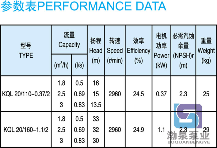 產品介紹 KQL20/110-0.37/2 立式管道離心泵供輸送不含固體顆粒的清水及物理化學性質類似于水的液體之用。同時根據使用溫度、介質等不同在ISG型管道離心泵基礎上派出適用熱水、高溫、腐蝕性化工泵、油泵。該產品具有同效節能、噪音低、性能穩定等特點。 用途: KQL20/110-0.37/2 立式管道離心泵用于空調、采暖、衛生用水、水處理冷卻冷凍系統、液體循環和供水、增壓及灌溉等領域中無腐蝕的冷水和熱水輸送。 工作條件: 轉速:2960r/min,1480r/min或980r/min 流量范圍:1.8~2000m3/h 揚程:≤127m 介質溫度:-10℃~120℃ 環境溫度:最大+40℃;海拔高度小于1000m;相對濕度不超過95% 材質: 泵殼、泵蓋、葉輪:鑄鐵 泵軸:45#鋼鍍鉻或不銹鋼(2Cr13) 機械密封動、靜環:浸銻石墨、碳化硅 結構:結構緊湊的單級泵,適用于現代建筑物。 產品特點: KQL20/110-0.37/2 立式管道離心泵結構緊湊、合理,泵與電機直接連接,外形美觀,占地面積小效率高,閉式鑄鐵葉輪,軸承配置合理,葉輪懸臂短,機泵軸完全同心,泵運行平穩、可靠,噪音低壽命長,強制環流沖洗機械密封,免保養、無滲漏。 選型指南: 例如:KQL80/160-7.5/2 或KQW80/160-7.5 KQL標準立式單級離心泵,KQW標準臥式單級離心泵 80進出口直徑 160葉輪名義直徑 7.5/2電機功率/電機極數 ![]() ![]() 因產品生產批次、型號不同,產品圖片及安裝尺寸僅供參考,詳情可聯系我們的銷售人員了解更多KQL20/110-0.37/2 立式管道離心泵相關信息!