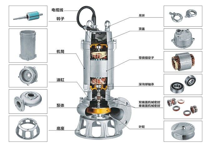 精鑄拋光不銹鋼潛水排污泵 WQ25-32-4S不銹鋼耐腐蝕潛水泵結構圖 1, 泵體,葉輪:在實測實驗基礎上,精心選擇和匹配泵體,葉輪,抗堵塞性好,效率高,功率曲線平坦不易過載,葉輪平衡精確,振動小,轉動平穩。 2, 電機:專門設計的潛水電機,F級絕緣IPX8防護,允許溫升升高F級105℃加環境溫度35℃,在正常溫升條件下,電機絕緣壽命延長,而潛水冷卻效果好,實際溫升低,電機絕緣壽命更長。 3, 軸封:電機軸封采用雙端面機械密封,形成兩道可靠的密封防線,有效地阻止水進入油室,正常使用情況下,無故障運行時間超過8000小時。 4, 電纜及其密封:電纜為耐污水加強型PVC與NBR橡膠護套,電纜線芯截面按40℃環境溫度及電動滿載功率下長期可靠運行設計;電機在非滿載功率下或在環境溫度40℃以下運行,使用壽命更長。電纜線,橡膠護套與電機蓋連接用壓改壓緊,防止介質從電纜與電機蓋接口面滲入電機內腔,絕對禁止搬運時用電纜拉扯(或作為提繩)。 5, 電機外殼:機殼,泵蓋,壓蓋等組成電機外殼,各零件連接配合處有可靠的密封,每臺都經嚴格的氣壓試驗檢查,確保無滲漏。